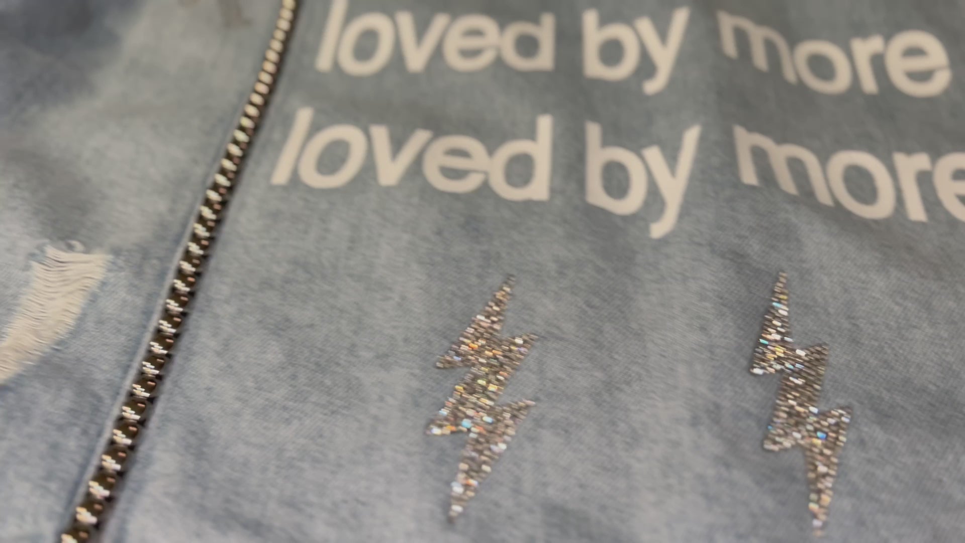 Loved By More™ Essential Jacket. 100% Cotton Distressed Denim Jacket. Featuring Rhinestone And Studded Accents. Dry Clean Only.